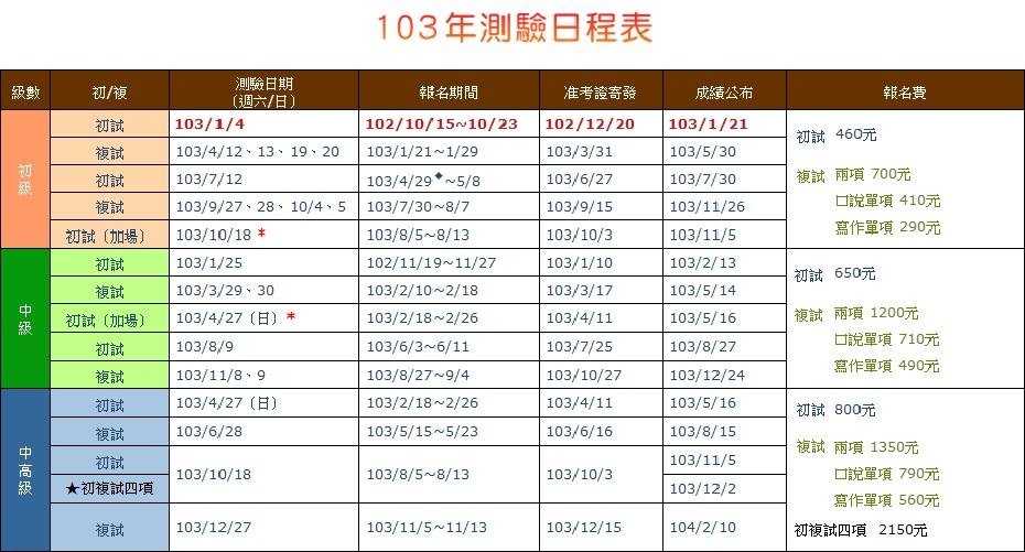 十二年國教明年上路,高雄、嘉義等縣市的高中職免試入學超額比序決定採認全民英檢成績,主辦的語言訓練測驗中心表示,明年第一次初級初試配合提前於1月舉辦,通過考生可於4月報考複試(說、寫),以便及早取得英檢成績。 全民英檢分初、複試兩階段進行,從應考初、複試到取得4項成績約需4個月。 測驗中心明年還將提供中高級初、複試 (聽、讀、說、寫4項技能)同日應考,考後6週內可取得成績,但僅限10月的中高級測驗。 配合高中職免試入學申請 明年「全民英檢」提早辦理免試入學申請 明年「全民英檢」提早辦理 財團法人語言訓練測驗中心(LTTC)10/9公佈103年「全民英檢」(GEPT)測驗日期以及二項重要新措施:一是上半年初級測驗將比往年提前一個月,於103年1月4日舉辦初試、4月中旬舉辦複試,方便申請高中職免試入學超額比序採計的考生即時取得英檢成績;二是中高級測驗將首度開放初、複試(聽、讀、說、寫四項技能)同日應考,六周內即可取得四項成績。
